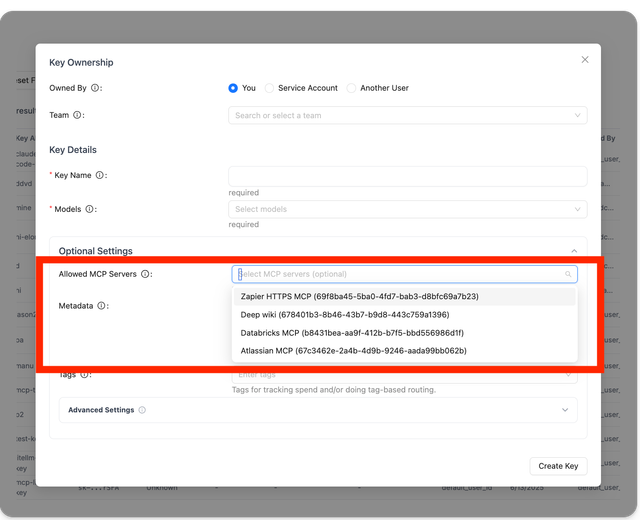 - Restrict MCP access by entity: Control which keys, teams, or organizations can access specific MCP servers